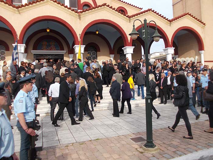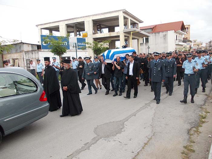 Άγημα της Αστυνομίας, με πένθιμο βηματισμό και τα όπλα υπό μάλης πλαισίωναν το καλυμμένο με την ελληνική σημαία φέρετρο του άτυχου αστυνομικού, το οποίο «συνόδευαν» περίπου 1.000 άνθρωποι, στηρίζοντας την οικογένειά του. Η πομπή έφτασε στον μητροπολιτικό ναό της Ανδραβίδας με τον Αρχηγό της ΕΛ.ΑΣ, αντιστράτηγο Δημήτριο Τσακνάκη, πλαισιωμένο από το Γενικό Γραμματέα Δημοσίας Τάξης κ. Αθανάσιο Ανδρεουλάκο, τον Περιφερειακό Διευθυντή