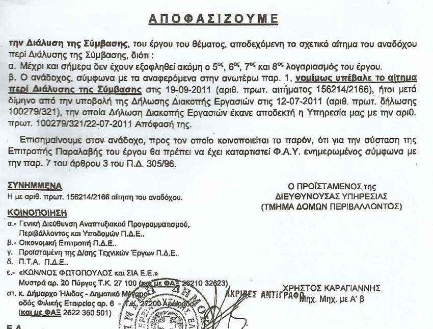 Ώσπου στις 24/10/2011, η Δ/νση Αναπτυξιακού Προγραμματισμού Περιβάλλοντος και Υποδομών Περιφέρειας Δυτ. Ελλάδας αποφασίζει (απόφαση με αριθ. πρωτ. 187055/3494), τη διάλυση της σύμβασης του έργου, αποδεχόμενη το σχετικό αίτημα του αναδόχου, διότι δεν είχαν εξοφληθεί ακόμη ο 5ος, 6ος, 7ος και 8ος λογαριασμός του έργου...