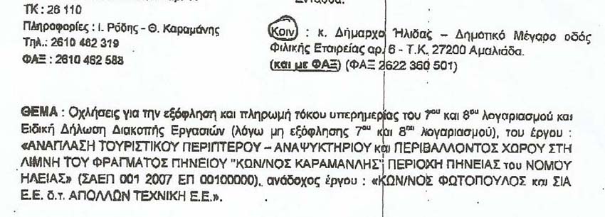 Στις 22/6/2011 το Π.Τ.Α. - Π.Δ.Ε. επανέρχεται και με δεύτερο έγγραφό του (αριθ. πρωτ. 53 228/1 620/22-6-2011) πάλι οχλεί τον κ. Δήμαρχο Ήλιδας για εξόφληση και πληρωμή τόκων υπερημερίας του 8ου λογ/σμου του έργου. Και πάλι ο κ. Γιάννης Λυμπέρης... ποιεί την νησαν!