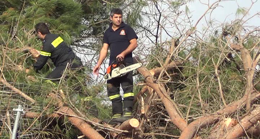 Τέσσερα οχήματα της Πυροσβεστικής Πύργου με είκοσι άνδρες επιχειρούν, κόβοντας τα