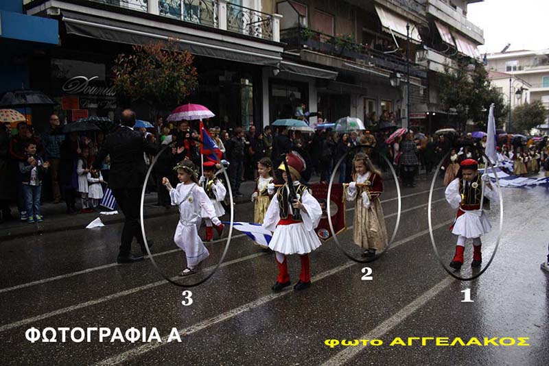 ΦΩΤΟΓΡΑΦΙΑ Α: Ο μικρός ,στον κύκλο 1, μούσκεμα από τη βροχή και το χαλάζι σκύβει το κεφαλάκι και παλεύει να προφυλαχτεί. Το δεξί του χεράκι, παγωμένο, χωμένο στο γιλέκο. Όμως, με το αριστερό κρατάει σταθερά όρθιο το κοντάρι με το λάβαρο που του έδωσαν. Δεξιά του, κύκλος 2, η μικρή συμμαθήτριά του, με τα μάτια μισόκλειστα για να προφυλαχτεί από τη βροχή και το χαλάζι, κρατάει σταθερά το λάβαρο με τον Ρήγα Φεραίο. Κρύβει την αριστερή της ξυλιασμένη παλάμη στο μανίκι… Στη μικρούλα, κύκλος 3, η λευκή της στολή, μούσκεμα, έχει κολλήσει στο παγωμένο κορμάκι της. Ζωσμένη με αλυσίδες και δαφνοστεφανομένη, (παριστάνει προφανώς την Ελλάδα), δέρνεται αλύπητα από το χαλάζι και τη βροχή. Όμως προχωράει… Ακριβώς πίσω τους, κάποια άλλα παγωμένα χεράκια δυσκολεύονται να κρατήσουν τεντωμένη τη σημαία. Έχει βαρύνει από τη βροχή και το χαλάζι και η σημαία σέρνεται στην άσφαλτο. Όμως προχωρούν…