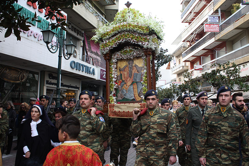 Τιμές απέδωσαν Στρατιωτικά αγήματα της Σ.Ε.Τ.Η.Λ. Πύργου και της 117 Πτέρυγος Μάχης Ανδραβίδος, το Παράρτημα του Ε.Ε.Σ. Πύργου, το Σώμα Ελλήνων Προσκόπων Πύργου, και η μαθητιώσα νεολαία, ενώ η Φιλαρμονική Εταιρία Πύργου «ΑΠΟΛΛΩΝ», παιάνιζε θρησκευτικά εμβατήρια κατά την λιτάνευση υπό την διεύθυνση του Αρχιμουσικού κ. Στάθη Θεοδόση.