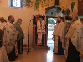 Την Πανηγυρική Θεία Λειτουργία, ευλογία του Σεβασμιωτάτου Μητροπολίτου μας κ.κ. Γερμανού, τέλεσε ο Αιδεσιμολογιότατος π. Θεμιστοκλής Χριστοδούλου, προϊστάμενος του Ιερού Ναού Αγίου Ελευθερίου Αχαρνών, συμπαραστατούμενος από τους Αιδεσ. π. Γεώργιο Τούμπα, π. Αυγερινό Τσουκαλά, τον οικείο Εφημέριο και τον ευλαβέστατο Ιεροδιάκονο π. Γεώργιο Γούτσο.