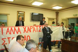 θέμα των τροφείων των Παιδικών Σταθμών του Δήμου. Από νωρίς, στην αίθουσα συνεδριάσεων είχαν καταφθάσει γονείς καθώς και μέλη του ΠΑΜΕ, κρατώντας ένα μεγάλο πανό.