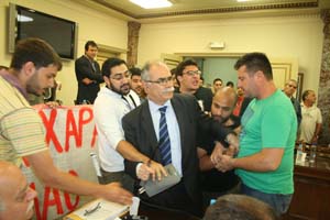 Τη στιγμή που ο Αντιδήμαρχος Οικονομικών, Γιάννης Αργυρόπουλος εισηγείτο το θέμα των τροφείων, μέλη του ΠΑΜΕ του επιτέθηκαν και άρχισαν να τον προπηλακίζουν. Εκείνη τη στιγμή, ο πρόεδρος του Δ.Σ. Στάθης Καννής έθεσε το θέμα σε ψηφοφορία. Τότε τα αίματα άναψαν. Μόλις ο πρόεδρος κατέβηκε από την έδρα να μοιράσει τα ψηφοδέλτια, τα μέλη του ΠΑΜΕ τον πλησίασαν και τον αιχμαλώτισαν, τυλίγοντάς τον με το πανό, ενώ συγχρόνως τον κλοτσούσαν στα πόδια. Για μισή ώρα, στη αίθουσα συνεδριάσεων επικρατούσε πανδαιμόνιο. Τελικά, με την επέμβαση των ψυχραιμότερων τα πνεύματα ηρέμησαν. Τα μέλη του ΠΑΜΕ αποχώρησαν και το Δ.Σ. συνέχισε τη συνεδρίασή του με άλλα θέματα.