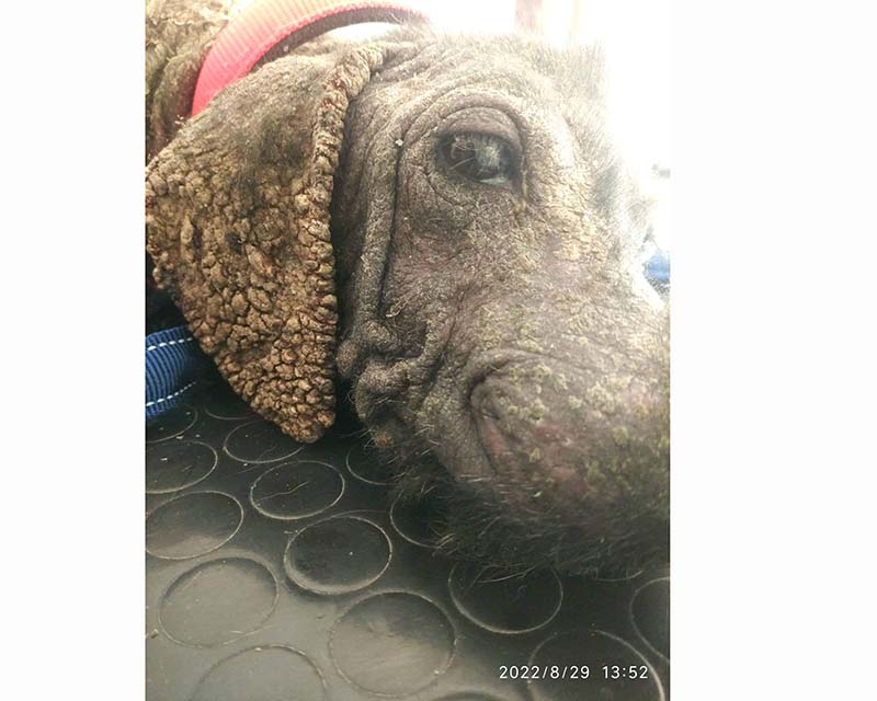 Το σκυλί είναι το πολύ 8 μηνών. Ένα κουτάβι που δεν έχει αλλάξει ακόμη όλα του τα δόντια. Ένα μωρό μου έλιωνε από την σαρκοπτική ψώρα και την πείνα. Ένα μωρό σκυλάκι που κυκλοφορούσε σαν φάντασμα και κανένας δεν του έδινε σημασία . Εκτός από τα δύο μικρά κορίτσια... Υπήρχαν στιγμές που πάνω στο κτηνιατρικό τραπέζι δεν μπορούσε να σταθεί όρθιο. Από την αδυναμία.
