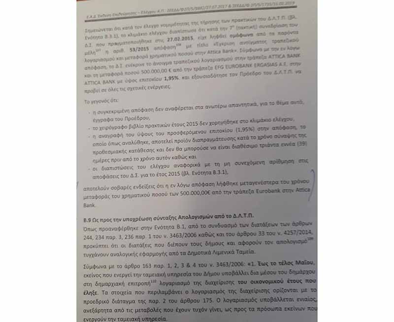Να αναφέρω επιγραμματικά πως γίνονται αναφορές για μη ανάρτηση αποφάσεων στη Διαύγεια, διενέργεια προσλήψεων χωρίς προκήρυξη, υποτιθέμενες συνδριάσεις Δ.Σ. χωρίς τήρηση και υπογραφή πρακτικών και χωρίς παρουσία μελών, μη χορήγηση αντιγράφων και πρακτικών σε μέλη του Δ.Σ. κατόπιν αίτησης τους, έλλειψη απολογισμών και μη προώθηση τους στο Δημοτικό Συμβούλιο, μη προώθηση προυπολογισμών στο Δημοτικό Συμβούλιο, μη τήρηση του Σ.Α.Λ.Ε., ορισμό αντιπρόεδρου του Δ.Σ. ως Υπευθύνου Ασφαλείας (Υ.Α.Λ.Ε.), είσπραξη χρημάτων από τα σκάφη στη μαρίνα – υπήρξαν και πρωτόδικες καταδίκες επ΄αυτού – κι ακόμα, κατάτμηση έργων και μελετών αξίας περίπου 400.000 ευρώ και απευθείας ανάθεση αυτών σε συγγενικά και παρένθετα πρόσωπα, θέματα λειτουργίας της Ταμειακής Υπηρεσίας του Δ.Λ.Τ.Π. και ορισμού του προέδρου του Δ.Σ. ως υπευθύνου για τη διενέργεια συναλλαγών με τράπεζες και υπηρεσίες για λογαριασμό του Νομικού Προσώπου, την εξαφάνιση στοιχείων για συγκεκριμένη χρονική περίοδο. Καθώς και την υπόθεση μεταφοράς ποσού 500.000 ευρώ από μια τράπεζα σε άλλη (όπου …όλως τυχαίως, αμέσως μετά κάποιοι έβγαλαν μπλοκ επιταγών σε εκείνη την τράπεζα αφού οι άλλες δεν παρείχαν…), και μάλιστα χωρίς απόφαση του Δ.Σ. αλλά μόνο με προσπάθεια δημιουργίας μιας μεταγενέστερης...