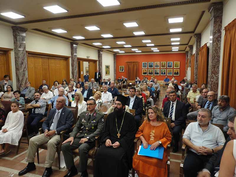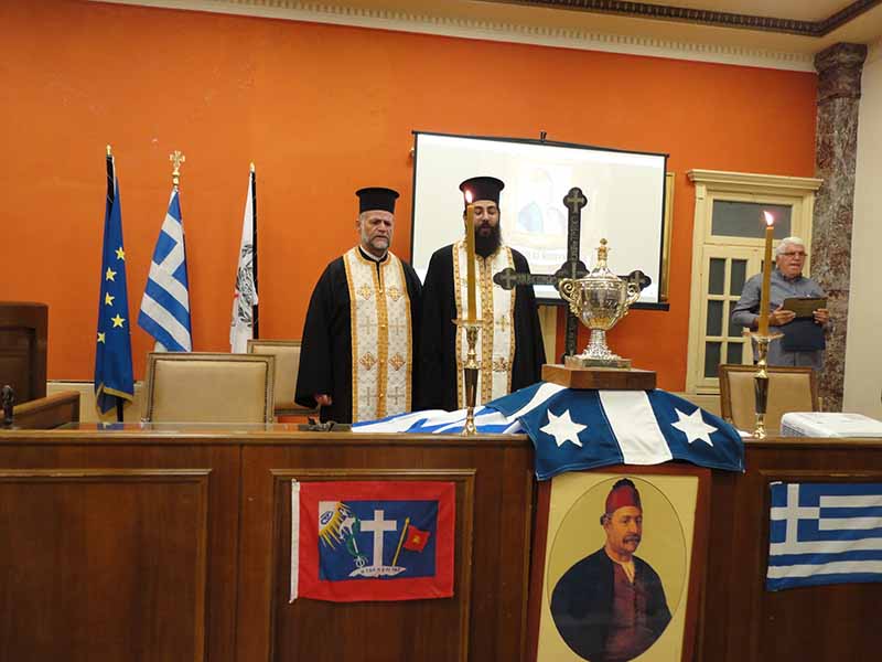 Στην αίθουσα συνεδριάσεων του Δ.Σ. αρχικά πραγματοποιήθηκε επιμνημόσυνη δέηση. Στην συνέχεια απεύθυναν χαιρετισμό ο δήμαρχο Στάθης Καννής και ο πρόεδρος του παραρτήματος Ηλείας της Ένωσης Απόστρατων Αξιωματικών Ναυτικού πλοίαρχος ε.α. Ζώης Υφαντής. Και οι δύο αναφέρθηκαν στην κοινή τους πρωτοβουλία για την υλοποίηση της ιδέας αυτής. Τόνισαν το «ξεχωριστό για την πόλη γεγονός», ενώ αναφέρθηκαν στην «ιστορική «πρώτη» παρουσία του αγωνιστή της λευτεριάς στην ναυμαχία του Κατακόλου στις 30 Σεπτέμβρη του 1821».