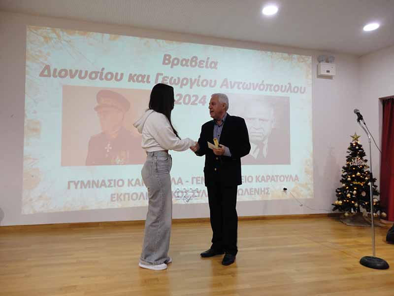 Μέσα σε μία συγκινησιακά φορτισμένη ατμόσφαιρα πραγματοποιήθηκε στην αίθουσα εκδηλώσεων του σχολικού συγκροτήματος Γυμνασίου-Λυκείου Καράτουλα, το πρωί της Παρασκευής, 22 Νοεμβρίου 2024, η απονομή των βραβείων «Διονυσίου και Γεωργίου Αντωνόπουλου» στους αριστεύσαντες μαθητές από τη Δημοτική Ενότητα Ωλένης.