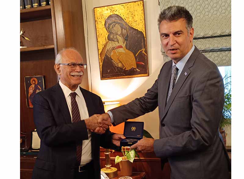 Πριν την καθιερωμένη δεξίωση στο Λάτσειο Δημοτικό Μέγαρο, ο κ. Καννής απένειμε αναμνηστική πλακέτα με το έμβλημα του Δήμου στον εκπρόσωπο της Κυβέρνησης, Γενικό Γραμματέα Διεθνών Οικονομικών Σχέσεων & Εξωστρέφειας Υπουργείου Εξωτερικών, Δημήτρη Σκάλκο.