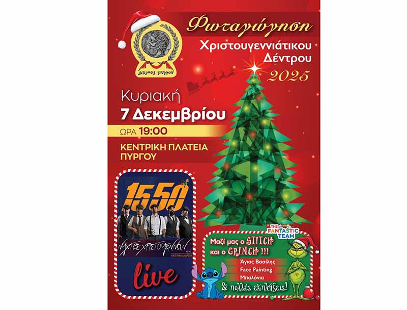 Ο Δήμος Πύργου σας προσκαλεί στην πιο αναμενόμενη και λαμπερή εκδήλωση του χρόνου, την επίσημη φωταγώγηση του Χριστουγεννιάτικου Δέντρου, την Κυριακή 7 Δεκεμβρίου στις 7:00 το απόγευμα στην Κεντρική Πλατεία Σάκη Καράγιωργα.