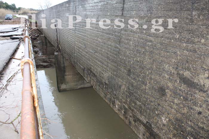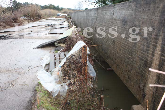 Παράλληλα, η τσιμεντένια αρδευτική διώρυγα είναι κυριολεκτικά στον αέρα, αφού όγκοι χώματος, που πάνω τους στηριζόταν η διώρυγα, έχουν παρασυρθεί από τα ορμητικά νερά.