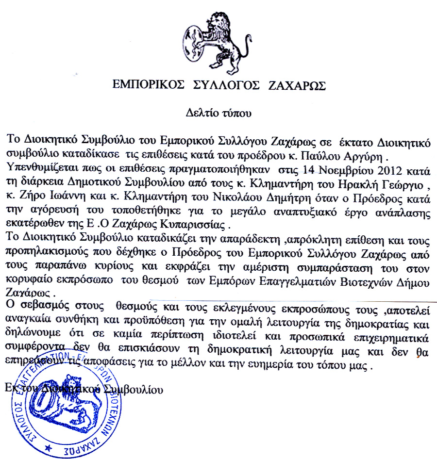 Το Διοικητικό Συμβούλιο του Εμπορικού Συλλόγου Ζαχάρως, σε έκτακτο Διοικητικό Συμβούλιο, καταδίκασε τις επιθέσεις εναντίον του προέδρου κ. Παύλου Αργύρη.