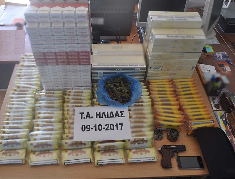 Κατασχέθηκαν έξι κιλά περίπου λαθραίου καπνού , (660) πακέτα λαθραίων τσιγάρων, (65) γραμμάρια κάνναβης και ένα πιστόλι