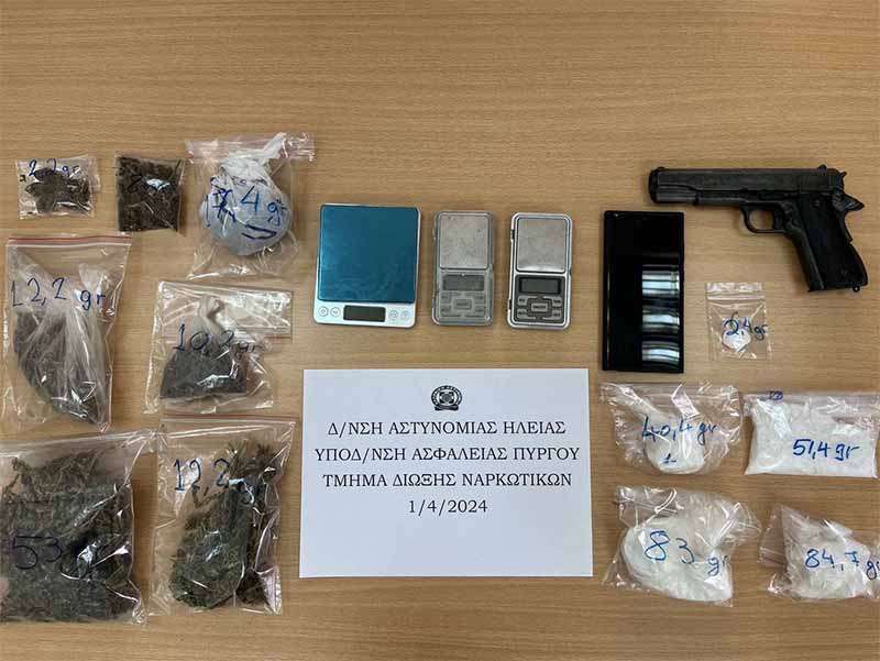 Κατασχέθηκαν 262 γραμμάρια κοκαΐνης, 115 γραμμάρια κάνναβης, ένα πιστόλι και τρεις ηλεκτρονικές ζυγαριές ακριβείας