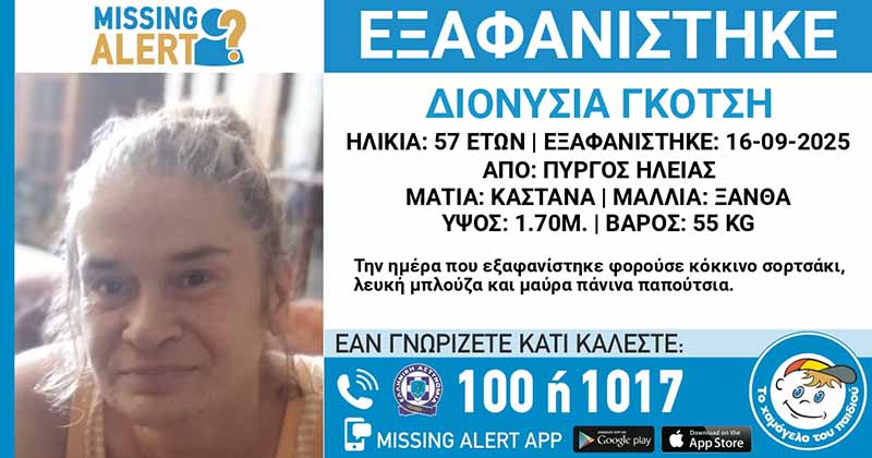 Στις 16/08/2025 εξαφανίστηκε από την περιοχή του Πύργου Ηλείας η Διονυσία Γκότση, 57 ετών. «Το Χαμόγελο του Παιδιού» ενημερώθηκε για την εξαφάνιση της στις 18/09/25, και προχώρησε στη δημοσιοποίηση των στοιχείων της Διονυσίας Γκότση, κατόπιν αιτήματος της οικογένειας της, καθώς ενδέχεται να συντρέχουν λόγοι οι οποίοι θέτουν τη ζωή της σε κίνδυνο.