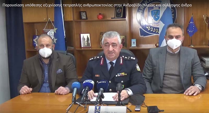 Ο Γενικός Περιφερειακός Αστυνομικός Διευθυντής Δυτικής Ελλάδας, Υποστράτηγος Απόστολος Μαρτζάκλης μίλησε στους δημοσιογράφους, ξετυλίγοντας το κουβάρι της στυγερής δολοφονίας και της σύλληψης του δράστη. Στο πλευρό του ήταν ο Διευθυντής της Υποδιεύθυνσης Ασφαλείας Πύργου Χαράλαμπος Πατσούρης και ο Διοικητής τμήματος Ασφάλειας Ήλιδας Χρήστος Αλεξανδρόπουλος.