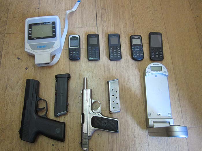 Στη κατοχή του 35χρονου, ο οποίος κατά τη σύλληψή του προέβαλλε σθεναρή αντίσταση, οι αστυνομικοί βρήκαν ένα πιστόλι, το οποίο περιείχε επτά φυσίγγια και ένα κινητό τηλέφωνο, ενώ στη κατοχή των δυο συνεργών του, οι οποίοι εντοπίστηκαν σε άλλο χώρο της φυτείας, βρέθηκαν και κατασχέθηκαν ένα αεροβόλο όπλο και τέσσερα ακόμα κινητά τηλέφωνα.