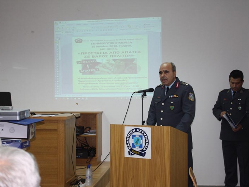 Με ιδιαίτερη επιτυχία, διοργανώθηκε και πραγματοποιήθηκε, χθες 15 Ιουνίου 2018, ενημερωτική ημερίδα, από τη Γενική Περιφερειακή Αστυνομική Διεύθυνση Δυτικής Ελλάδας, στην αίθουσα της Περιφερειακής Ένωσης Δήμων στον Πύργο, με θέμα : «Προστασία από απάτες σε βάρος πολιτών ».