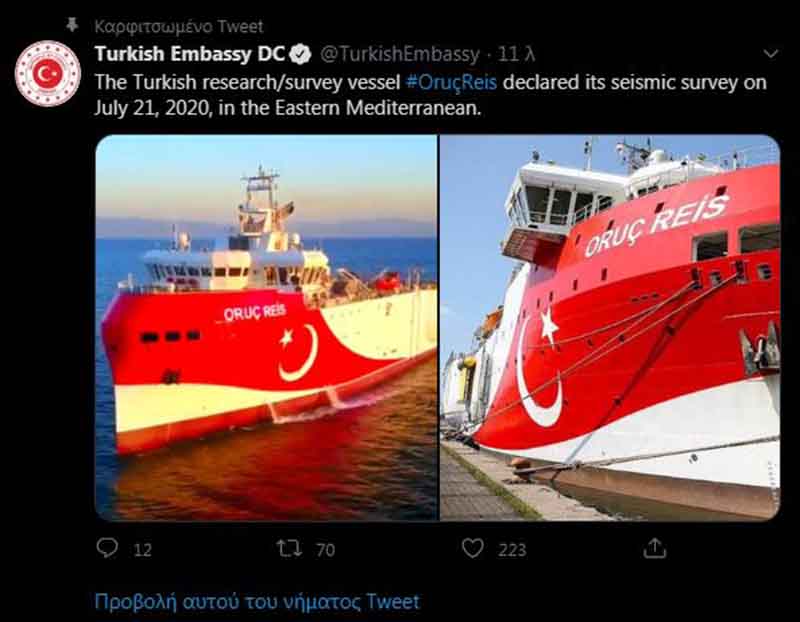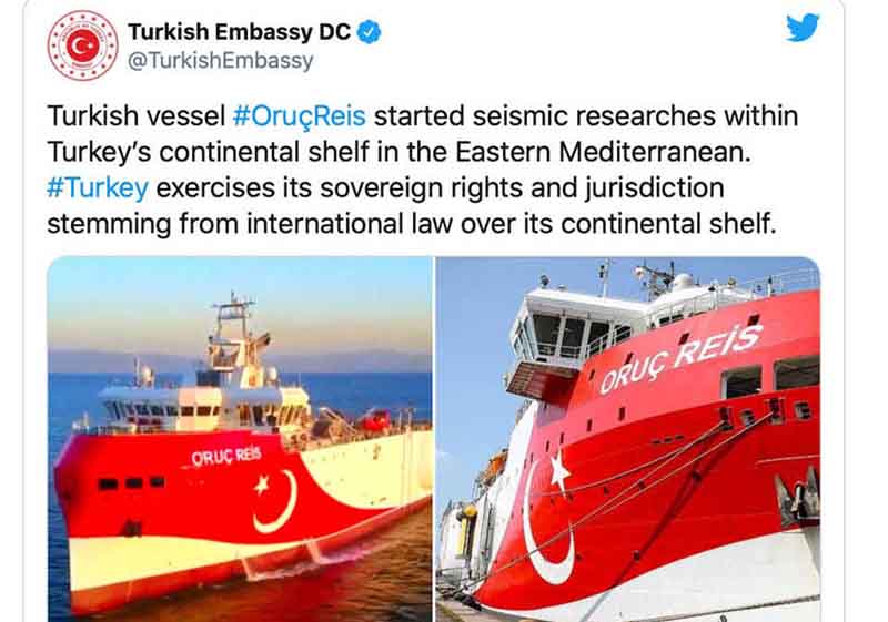«Το τουρκικό σκάφος Oruç Reis ξεκίνησε σεισμικές έρευνες στην υφαλοκρηπίδα της Τουρκίας στην Ανατολική Μεσόγειο. Η Τουρκία ασκεί τα κυριαρχικά δικαιώματα και τη δικαιοδοσία της στην υφαλοκρηπίδα που απορρέουν από το Διεθνές Δίκαιο.»