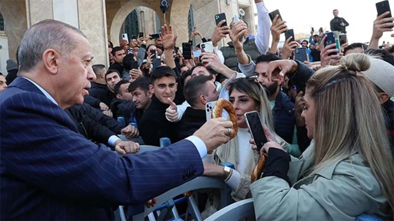 Μετά από μια σύντομη συνομιλία με τους παρευρισκομένους, ο Ερντογάν αποφάσισε να μοιράσει κουλούρια με σουσάμι στους πολίτες.