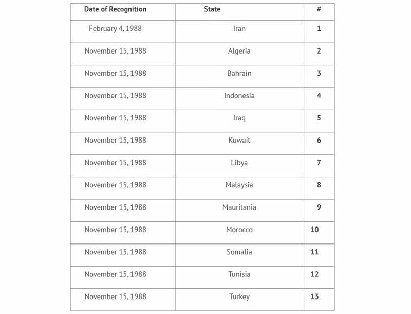 Στα τέλη της δεκαετίας του 1980 και στις αρχές της δεκαετίας του 1990, σχεδόν 20 χώρες αναγνώρισαν την Παλαιστίνη, ακολουθούμενες από 12 ακόμη χώρες μεταξύ 2000 και 2010 – κυρίως από όλη την Αφρική και τη Νότια Αμερική.