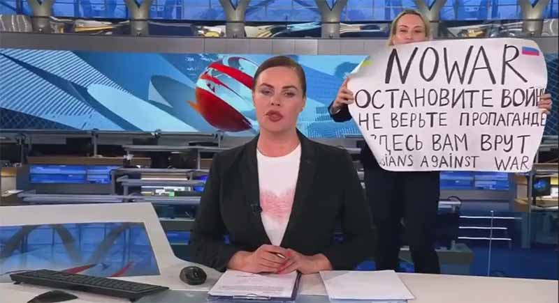 Μία διαδηλώτρια διέκοψε απόψε το κεντρικό δελτίο ειδήσεων του πρώτου καναλιού της δημόσιας ρωσικής τηλεόρασης, κρατώντας πλακάτ πίσω από την παρουσιάστρια με μηνύματα κατά του πολέμου στην Ουκρανία.