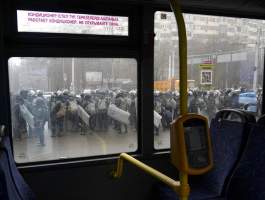 Δημοσιογράφοι του Γαλλικού Πρακτορείου είπαν ότι είδαν αστυνομικούς να ρίχνουν δακρυγόνα και βομβίδες κρότου-λάμψης για να διαλύσουν ένα πλήθος 5.000 ανθρώπων. «Κυβέρνηση παραιτήσου» και «Έξω ο γέρος» [σ.σ. ο Νουρσουλτάν Ναζαρμπάγεφ], φώναζαν οι συγκεντρωμένοι.