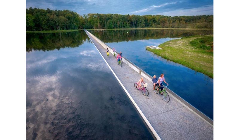 Αντί να περιορίσει τους τουρίστες στο να απολαμβάνουν τη θέα της λίμνης μόνο από της όχθες της ή να χτίσει μια γέφυρα πάνω από τη λίμνη, η τοπική κοινότητα αποφάσισε να εφαρμόσει ένα διαφορετικό τρόπο προσέγγισης της λίμνης κατασκευάζοντας έναν ποδηλατόδρομο που «κόβει» το νερό στα δυο.