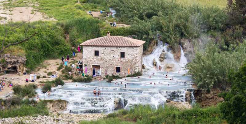 Ανάμεσα στους λόφους και τους αμπελώνες της υπαίθρου της Τοσκάνης βρίσκεται ένα από τα πιο εντυπωσιακά τουριστικά αξιοθέατα όχι μόνο στην Ιταλία, αλλά σε ολόκληρο τον κόσμο – ένας καταρράκτης που ρέει σε λευκές πισίνες από ασβεστόλιθο που ξεχειλίζουν με ζεστό, τιρκουάζ νερό.