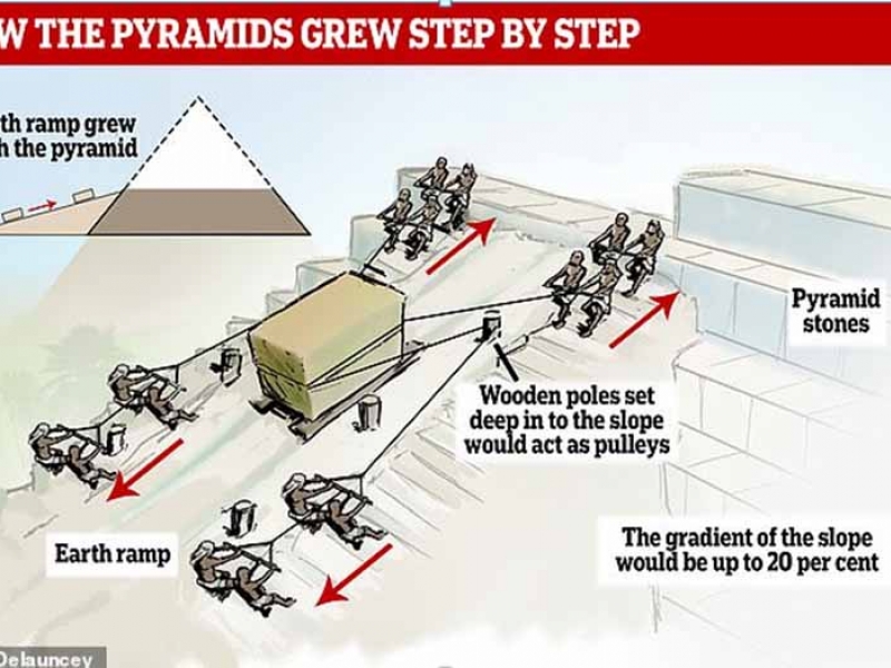Στη φωτογραφία που θα δείτε, φαίνεται ότι οι Αιγύπτιοι βρίσκονταν δεξιά και αριστερά από τη ράμπα, που έχει κλίση περίπου 20%, στις σκάλες, τραβώντας ταυτόχρονα τα σκοινιά με τα οποία δένονταν και μεταφέρονταν οι πέτρες. Αυτό αφενός σημαίνει, ότι οι αρχαίοι Αιγύπτιοι μιμούνταν την κίνηση της τροχαλίας, τραβώντας ταυτόχρονα τα σχοινιά, για να μπορέσουν να μετακινήσουν τις πέτρες και αφετέρου ότι δεν συνήθιζαν να τραβούν πίσω τους τις πέτρες όσο οι ίδιοι ανέβαιναν στις ράμπες.