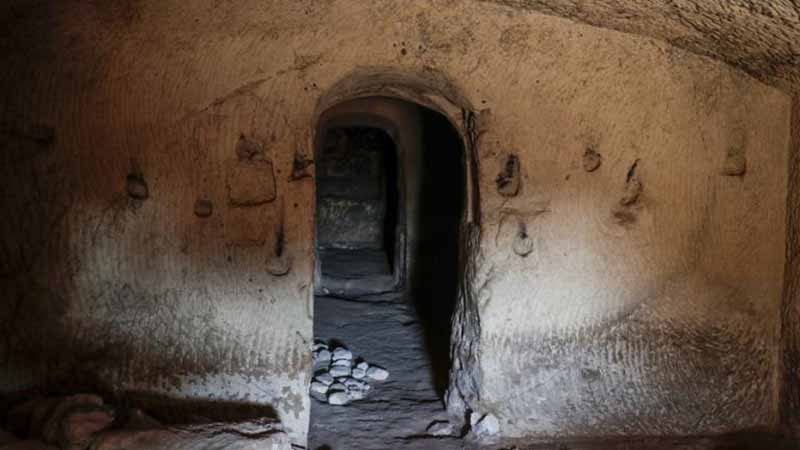 Τους τελευταίους δύο μήνες, οι αρχαιολόγοι έχουν ανασκάψει μια περίτεχνη αυλή 350 τετραγωνικών μέτρων στην είσοδο του σπηλαίου, γεμάτη με περίπλοκα πέτρινα γλυπτά, ψηλές καμάρες, μωσαϊκό δάπεδο και τα ερείπια ενός καταστήματος όπου οι προσκυνητές μπορεί να νοίκιαζαν λάμπες λαδιού για να φωτίσουν τον δρόμο τους μέσα στη σπηλιά για τις προσευχές τους.