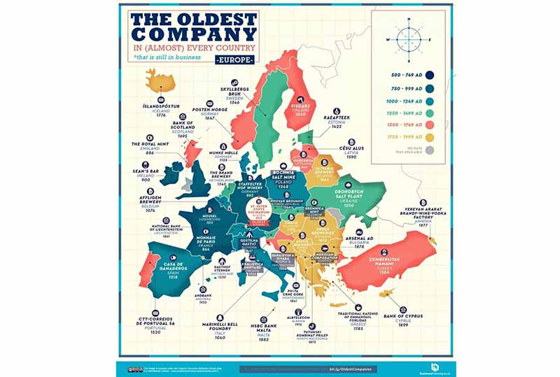 Στο χάρτη βλέπετε τις παλαιότερες εταιρείες στην Ευρώπη, όπως και την παλαιότερη ελληνική επιχείρηση.