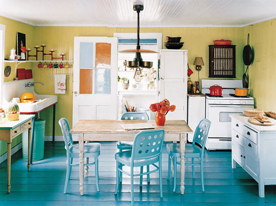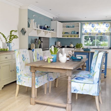 Στο ίδιο πνεύμα και η κουζίνα. Λευκό παντού. Ταβάνια, τοίχοι, έπιπλα, όλα αντανακλούν τον ανοιξιάτικο ήλιο. Πολύχρωμα τραπεζομάντιλα, καλύμματα καρεκλών ή ακόμα και παράταιρες πολύχρωμες καρέκλες διώχνουν την καταχνιά του χειμώνα. Οι διακοσμητές, όπως και το χειμώνα, επιμένουν και στα παράταιρα πιατικά, φλιτζάνια, πιατάκια, κλπ.