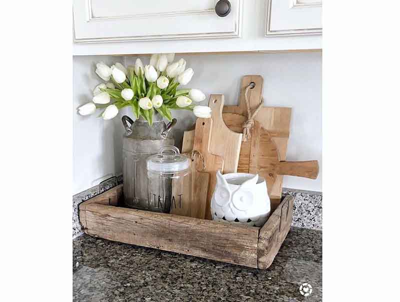 Ένας δίσκος με τα βαζάκια που χρησιμοποιούμε συχνά στον πάγκο, τα ρετρό μας φλιτζανάκια και λουλούδια, φρέσκα ή αποξηραμένα, διακοσμούν μοναδικά τον χώρο.