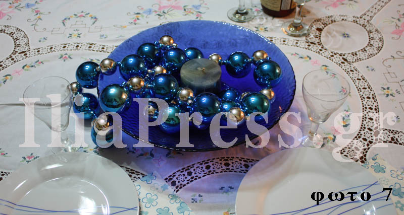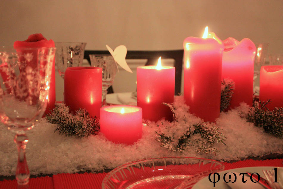 Για μια πιο ζεστή ατμόσφαιρα, μπορείτε να διακοσμήσετε το κέντρο του τραπέζιου σας με κεριά, είτε βάζοντάς τα το ένα δίπλα στο άλλο είτε στολίζοντας μια πιατέλα με κεριά και ροδοπέταλα ή χριστουγεννιάτικα στολίδια(φωτο 1 και 6).