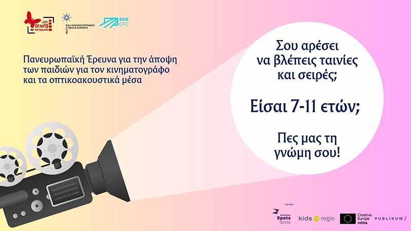 Το KIDS Regio (Γερμανία) και η PUBLIKUM.io (Δανία) συνεργάζονται σε μια έρευνα για την άποψη των παιδιών για τις ταινίες και τις σειρές σε 12 ευρωπαϊκές χώρες. Συμμετέχοντας, μπορείς να βοηθήσεις τους Ευρωπαίους δημιουργούς, αλλά και όσους χαράζουν πολιτική, να κατανοήσουν καλύτερα το νεανικό κοινό.