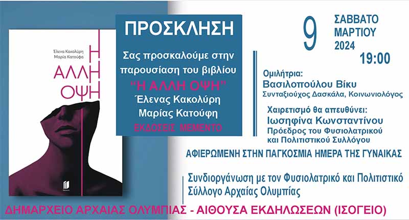 Το βιβλίο «Η Άλλη Όψη» των Ηλείων συγγραφέων, Έλενας Κακολύρη και Μαρίας Κατούφα, το οποίο κυκλοφορεί από τις εκδόσεις Memento, παρουσιάζεται το Σάββατο 9 Μαρτίου και ώρα 19:00 στην αίθουσα εκδηλώσεων του Δημαρχείου Αρχαίας Ολυμπίας. Το έργο αυτό δημιουργήθηκε στα πλαίσια της κοινωνικής ευαισθητοποίησης κατά της έμφυλης βίας και «αποτελεί μια προσπάθεια να γίνουμε, ως κοινωνία, μέρος της λύσης και όχι του προβλήματος››, όπως χαρακτηριστικά σημειώνουν οι δύο συγγραφείς.
