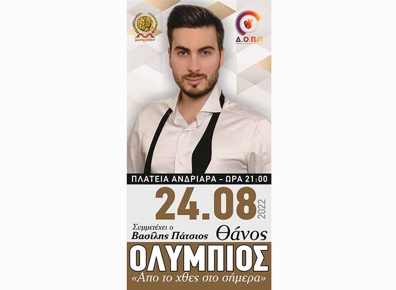 Την Τετάρτη (24/8) η εξ αναβολής εκδήλωση στην πλατεία Ανδριάρα Πύργου με συναυλία του Θάνου Ολύμπιου