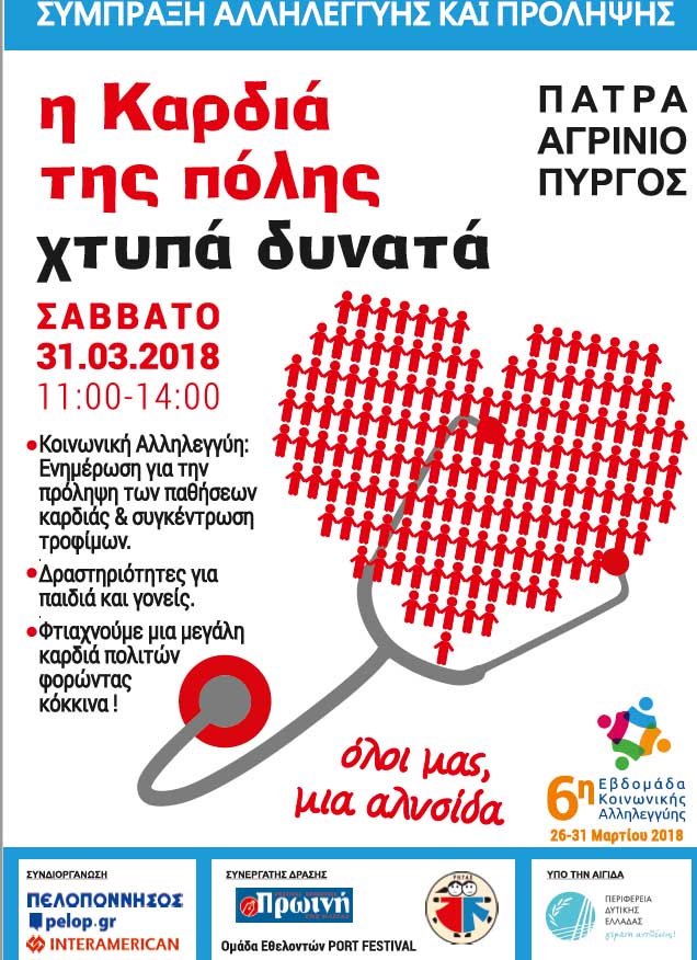 Χτυπά και μας καλεί να συμμετάσχουμε στη μεγάλη κοινή δράση προσφοράς και αλληλεγγύης που πραγματοποιείται για πρώτη φορά σε συνεργασία των 3 μεγάλων πόλεων της Περιφέρειας Δυτικής Ελλάδας, στο πλαίσιο της Εβδομάδας Κοινωνικής Αλληλεγγύης, με στόχο την ενημέρωση και την ευαισθητοποίηση του κοινού σε θέματα υγείας.