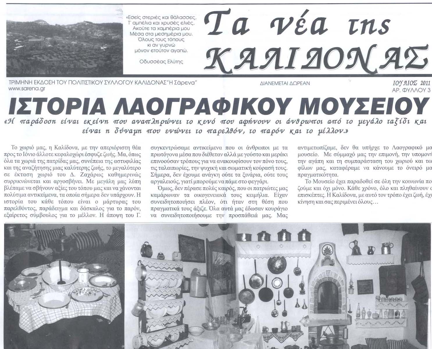 Κυκλοφόρησε η εφημερίδα «Τα Νέα της Καλίδονας», μια τρίμηνη έκδοση του πολιτιστικού συλλόγου της Καλίδονας «Σάρενα», με κύριο θέμα την ιστορία του Λαογραφικού Μουσείου του χωριού.
