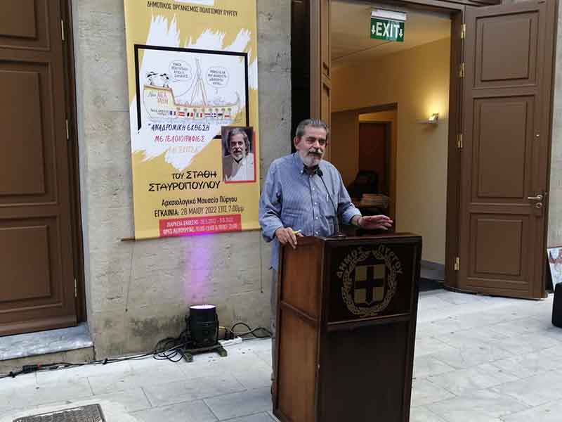 Εκεί που το παρελθόν ενώνεται με το παρόν, οι μνήμες μιας άλλης εποχής αναμειγνύονται αρμονικά με το σήμερα, στο Αρχαιολογικό Μουσείο του Πύργου, πλήθος πολιτών τίμησαν με την παρουσία τους τον “δικό” μας Στάθη. Τον Στάθη Σταυρόπουλο, που με την αιχμηρή του πένα σκιτσογραφεί και καυτηριάζει δεκαετίες τώρα την κοινωνική και πολιτική πραγματικότητα, στα εγκαίνια της “Αναδρομικής έκθεσης με γελοιογραφίες και σκίτσα” που διοργάνωσε με μεγάλη επιτυχία ο Δήμος Πύργου και ο Δημοτικός Οργανισμός Πολιτισμού.