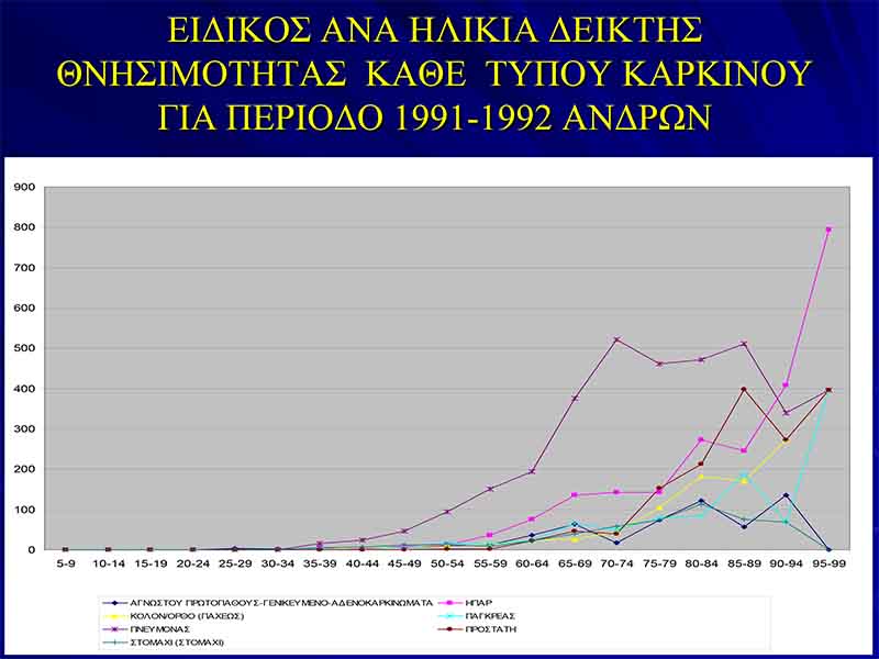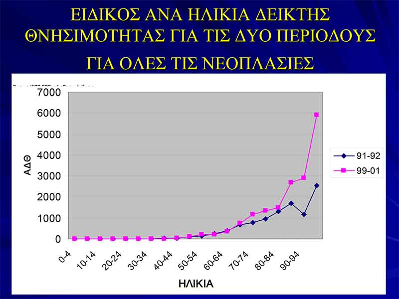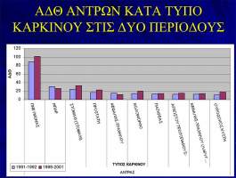 • Ένα άλλο στοιχείο που προκύπτει από την ανάλυση είναι ότι η επιμέρους διάγνωση των νεοπλασιών διαφέρει ουσιαστικά σε ορισμένους καρκίνους όπως π.χ. ο καρκίνος του ήπατος αναφέρεται σαν δεύτερη αιτία θανάτου από κακοήθη νεοπλασίες και στις δυο περιόδους.