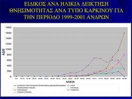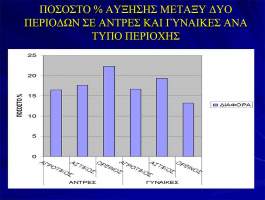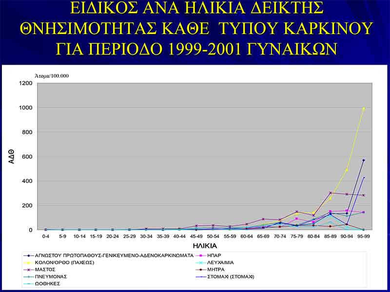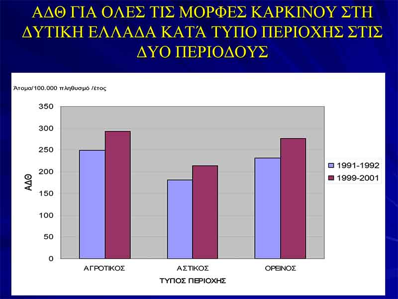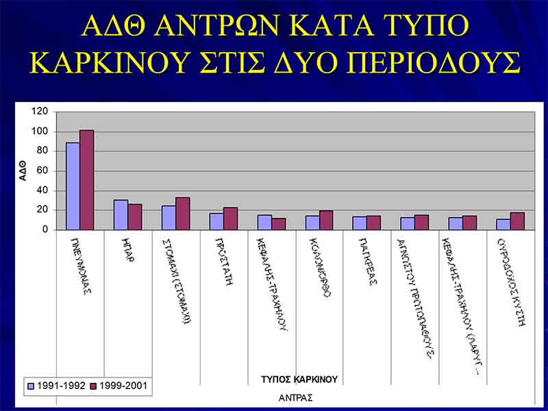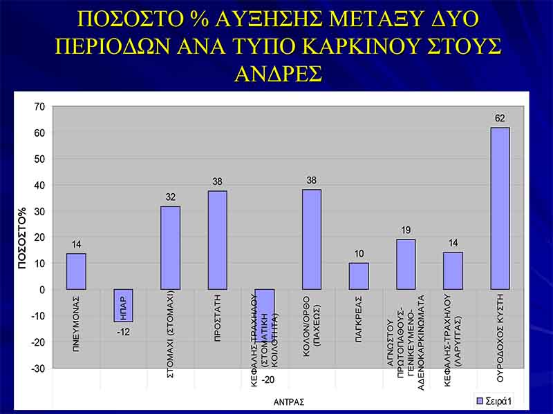 4. Η πρώτη νεοπλασία σε αύξηση του ποσοστού της στους άνδρες είναι αυτή του παχέως εντέρου με δεύτερη αυτή της ουροδόχου κύστεως και τρίτη αυτή του πνεύμονος. Στις γυναίκες η πρώτη νεοπλασία σε αύξηση του ποσοστού της είναι αυτή του παχέως εντέρου, δεύτερη αυτή του παγκρέατος και τρίτη αυτή του μαστού. Ομοιότητες αυξήσεων παρατηρήθηκαν σε κάθε τύπο περιοχής.