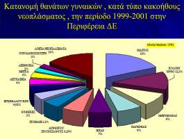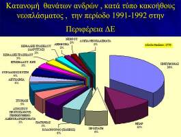 8. Ένα άλλο στοιχείο που χρήζει περαιτέρω διερεύνησης είναι ότι η επιμέρους διάγνωση των νεοπλασιών διαφέρει ουσιαστικά σε ορισμένους καρκίνους όπως π.χ. ο καρκίνος του ήπατος αναφέρεται σαν δεύτερη αιτία θανάτου από καοήθη νεοπλασίες και στις δύο περιόδους, με μείωση από 11% σε 8% την δεύτερη περίοδο. Πιστεύουμε ότι το παραπάνω στοιχείο μπορεί να οφείλεται α)στην διαφοροποίηση του θεράποντος ιατρού από τον ιατρό που εξέδωσε το Πιστοποιητικό Θανάτου, β) στην μικρότερη εμπειρία του θεράποντος ιατρού ως προς την διαφορική διάγνωση πρωτοπαθούς ή δευτεροπαθούς νεοπλασίας ήπατος δεδομένης της έλλειψης ανάπτυξης πλήρων δομών Κλινικής Ογκολογίας στην περιφέρεια Δυτικής Ελλάδος, γ)άλλες αιτίες υπό συζήτηση