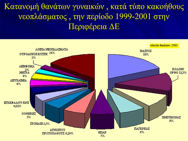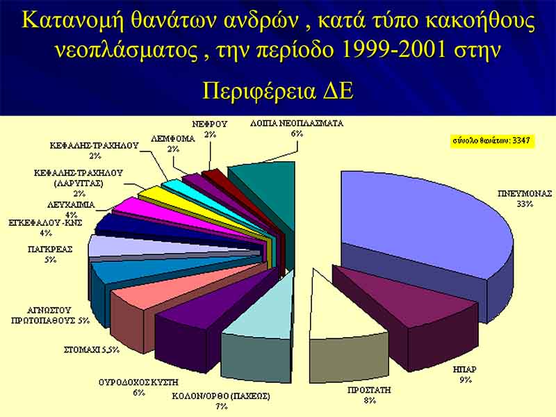 3. Σαν πρώτη αιτία θανάτου στους άνδρες είναι ο καρκίνος του πνεύμονος με δεύτερη τον καρκίνο του ήπατος και τρίτο το καρκίνο του στομάχου. Ενώ στις γυναίκες πρώτη είναι ο καρκίνος του μαστού, δεύτερη ο καρκίνος του παχέως εντέρου και τρίτη ο καρκίνος του ήπατος.