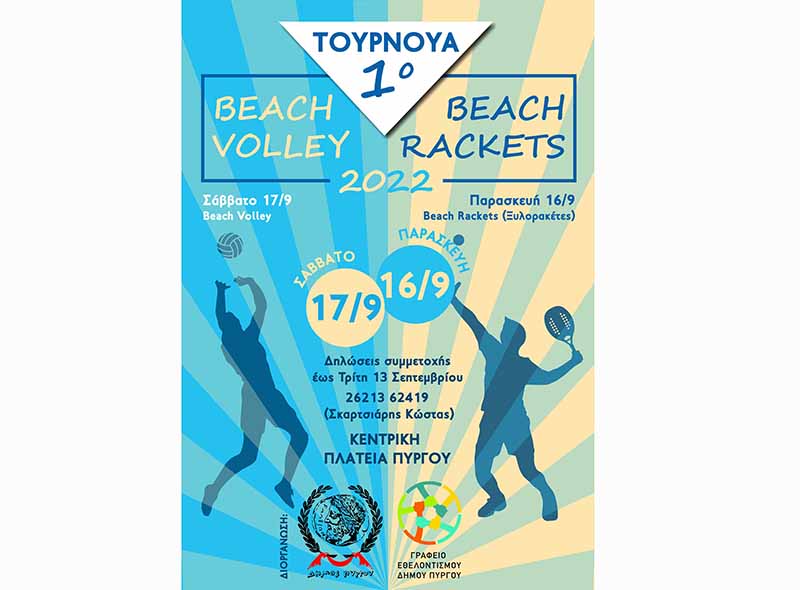 Η πρωτοποριακή αθλητική εκδήλωση, που περιλαμβάνει το 1ο BEACH RACKETS την Παρασκευή 16/9 και το 1ο BEACH VOLLEY το Σάββατο 17/9, στην κεντρική πλατεία Πύργου, ήταν το αντικείμενο της συνέντευξης Τύπου που παραχώρησε ο δήμαρχος Πύργου Παναγιώτης Αντωνακόπουλος, παρουσία του αντιδημάρχου Αθλητισμού Γιάννη Αργυρόπουλου και του προέδρου του Ομίλου Ρακετιστών Κουρούτας Αμαλιάδας Γιώργου Νικολόπουλου.