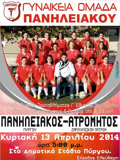 Η είσοδος στον αγώνα θα είναι ΕΛΕΥΘΕΡΗ. Σας περιμένουμε όλους για να γιορτάσουμε την άνοδο των γυναικών. Θα έχει, ο τελευταίος αγώνας της ομάδας του Πανηλειακού, εορταστικό χαρακτήρα , μιάς και θα γίνει απονομή του κυπέλου στην ΠΡΩΤΑΘΛΗΤΡΙΑ ομάδα του Πανηλειακού.