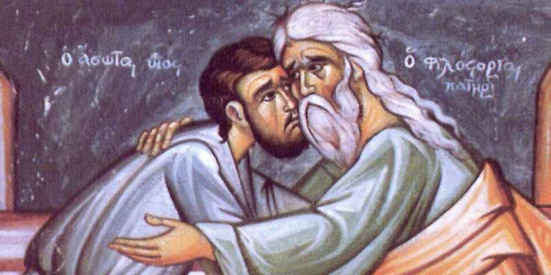 Είπε ο Κύριος την παραβολήν ταύτην. Άνθρωπος τις είχε δύο υιούς. Και είπεν ο νεώτερος αυτών τώ πατρί, πάτερ δός μοι το επιβάλον μέρος της ουσίας. και διείλεν αυτοίς τον βίον. Και μετ’ ου πολλάς ημέρας συναγαγών άπαντα ο νεώτερος υιός απεδήμησεν εις χώραν μακράν, και εκεί διεσκόρπισε την ουσίαν αυτού ζών ασώτως… Και αναστάς ήλθε προς τον πατέρα αυτού, έτι δε αυτού μακράν απέχοντος είδεν αυτόν ο πατήρ αυτού και εσπλαγχνίσθη, και δραμών επέπεσεν επι τον τράχηλον αυτού και κατεφίλησεν αυτόν. Είπε δε αυτώ ο υιός. Πάτερ, ήμαρτον εις τον ουρανόν και ενώπιον σου, και ουκέτι ειμί άξιος κληθήναι υιός σοι… Είπε δε ο πατήρ… εξενέγκατε την στολήν την πρώτην…και δότε δακτύλιον… και υποδήματα… και ενέγκαντες τον μόσχον τον σιτευτόν θύσατε…