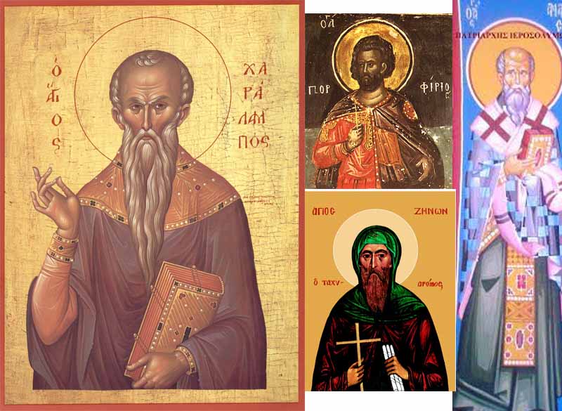 10 Φεβρουαρίου - Άγιος Χαράλαμπος ο Ιερομάρτυρας, Όσιος Ζήνων ο Ταχυδρόμος, Άγιοι Βάπτος και Πορφύριος, Άγιες Τρεις Γυναίκες, Άγιοι Ενναθά, Ουαλεντίνα και Παύλος, Άγιος Αναστάσιος Πατριάρχης Ιεροσολύμων, Σύναξη της Υπεραγίας Θεοτόκου εν τοις Αρεοβίνδου, Οσία Άννα η Πριγκίπισσα, Όσιος Πρόχορος εκ Ρωσίας, Άγιος Βασίλειος Αρχιεπίσκοπος Νόβγκοροντ της Ρωσίας, Άγιος Ιωάννης ο Φιλόσοφος, Όσιος Λογγίνος ο Ερημίτης, Άγιοι Πάντες Ιεράρχες εν Νόβγκοροντ της Ρωσίας, Ανάμνηση Θαύματος απαλλαγής νήσου Ζακύνθου εκ της πανώλης και Διήγηση περί υπακοής στους γονείς και σεβασμού της ιερής Λειτουργίας